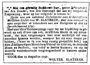 Naschrift: Van het gedrag van Wolter werd in vele kranten melding gemaakt. Ook werd er een artikel aan hem gewijd in de volksalmanak voor 1798: