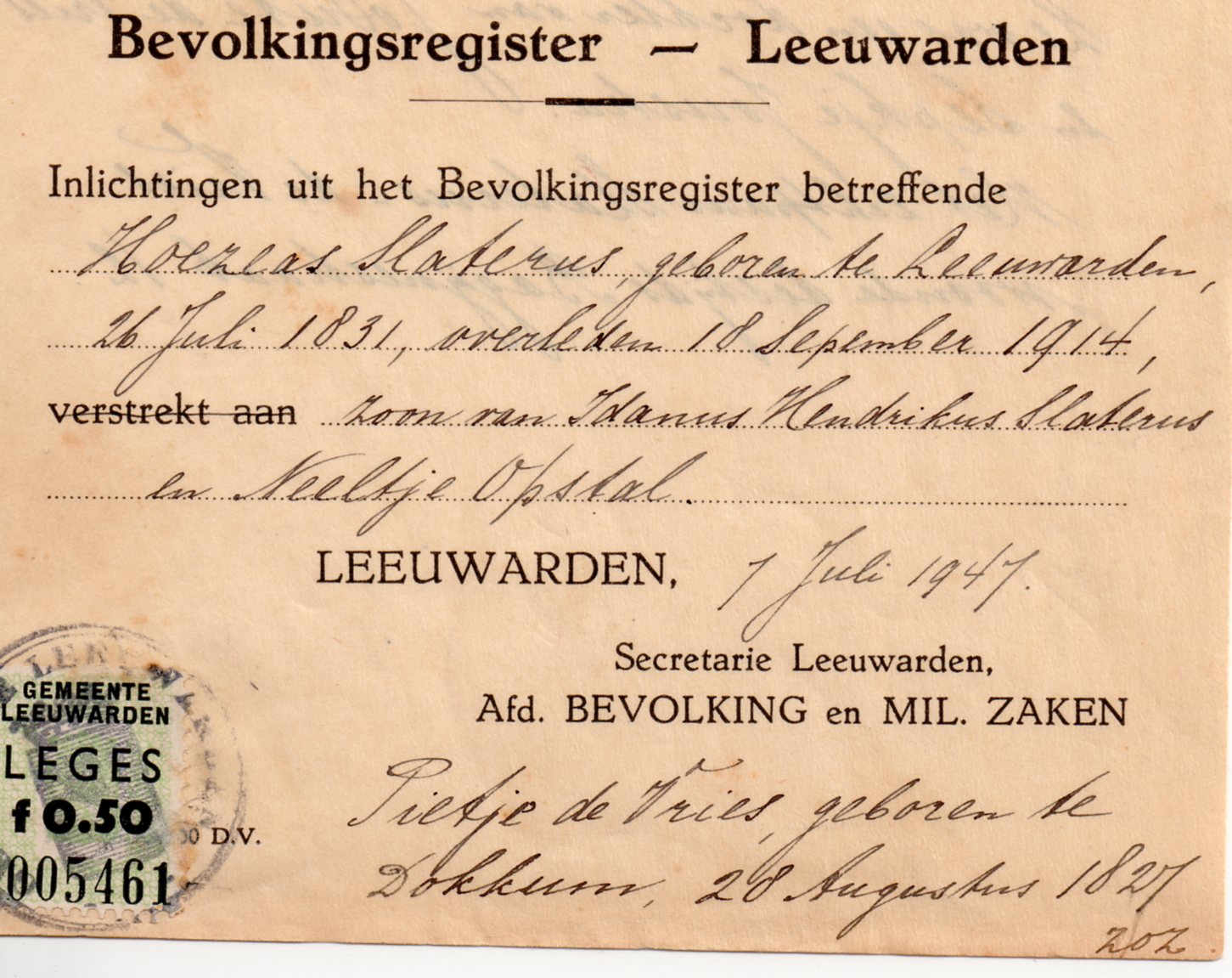 Bij het uittreksel lag een brief van de heer Bartels uit Groningen, die navraag deed naar zijn familieband met de familie Slaterus in Leeuwarden. Deze naam stond nog vermeld in het telefoonboek. Het bezoek aan hem was de start een een verrassende tocht…