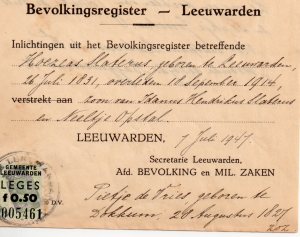 “Tante Teun” was nooit getrouwd geweest en had haar hele leven ingewoond bij haar ouders. Lang heeft ze gezorgd voor haar moeder en nog langer voor haar vader, die de leeftijd van 100 jaar bereikte. Ze had niet alleen de mooie handgesneden meubelen, gemaakt door haar grootvader Frans Dijkstra, bewaard, maar ook de familiefoto’s en papieren. In een doosje vond ik een uittreksel van het Bevolkingsregister van vlak na de oorlog.