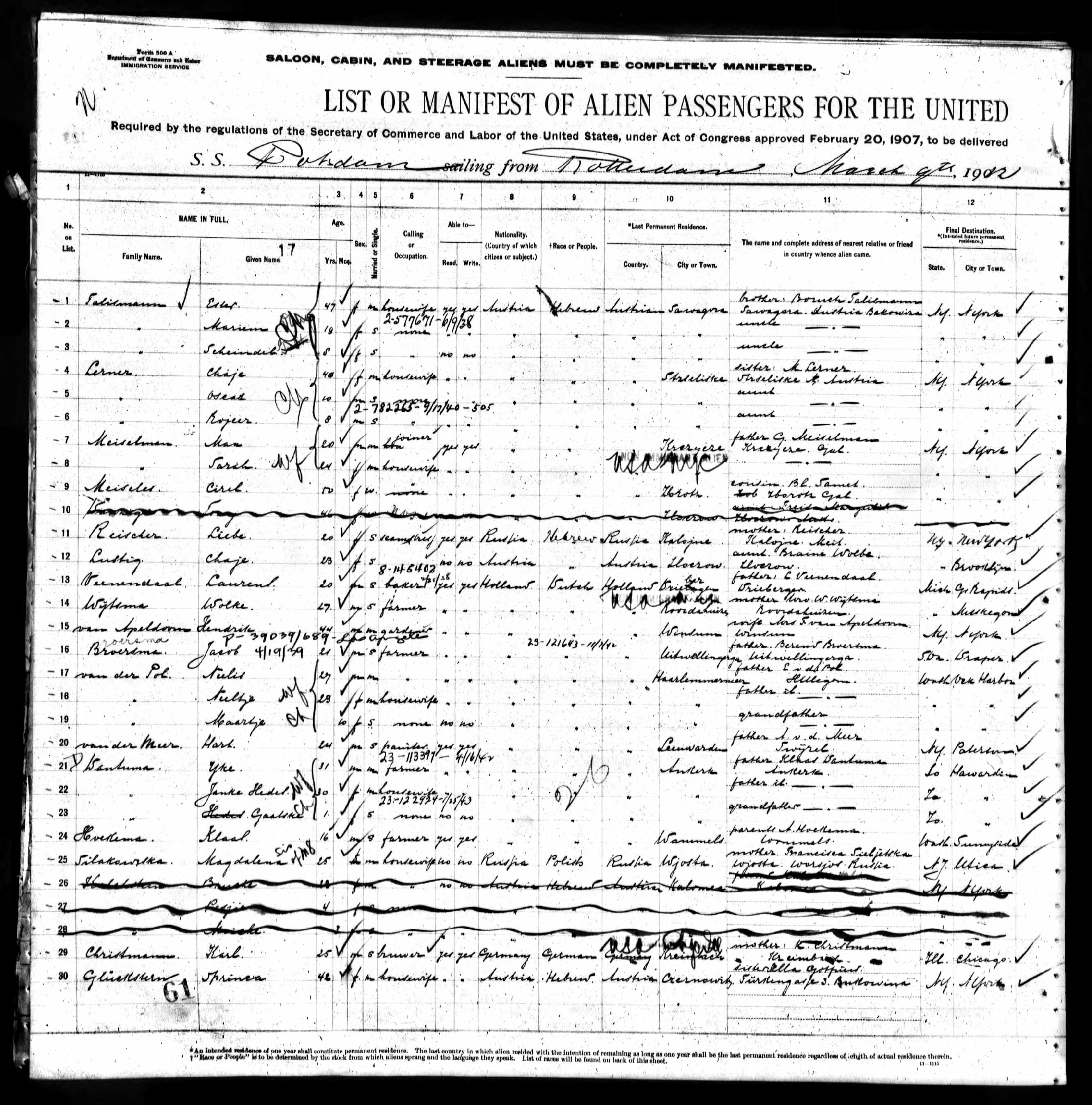 Deze week zijn op ancestry.com de ‘immigration records’ van de U.S.A. gratis ter inzage. Daar maakte ik dankbaar gebruik van, omdat ik nog op zoek was naar gegevens van twee dochters van Wolter Slaterus, die begin 20ste eeuw met hun gezinnen zijn geëmigreerd naar Amerika. Het was lastig zoeken, omdat niet alle namen correct gespeld waren, maar met wat fantasie heb ik ze gevonden.