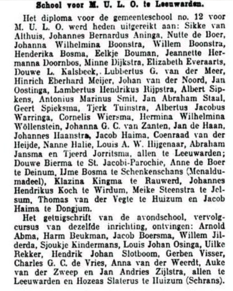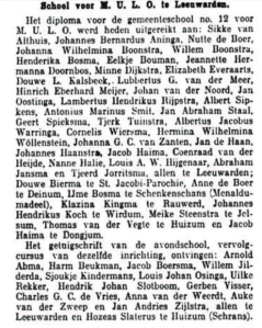 Op de dag dat Prinses Juliana werd geboren, lezen we in de krant dat mijn opa het einddiploma van deze school heeft gekregen. Daarna deed hij nog de vervolgopleiding: “Aan de nieuwe dagschool zal aansluiten een cursus ter voorbereiding voor handel en administratie. Dis cursus zal twee leerjaren omvatten en gehouden worden minstens 5 keeren ‘s weeks, des avonds gedurende 2 of meer uren, hoofdzakelijk ten dienste van hen, du» des daags als volontair, bediende of klerk in een winkel, werkplaats, kantoor of bureau werkzaam zijn. Onder de vele practische en nuttige zaken die op dien avondcursus zullen worden onderwezen, zullen zeker warenkennis, handelscorrespondentie in Nederlandsch en vreemde talen, voortgezette oefening in die talen, boekhouden, stenographie, machinaal schrijven, handelsaardrijkskunde, handelsrecht e.a. niet ontbreken.”