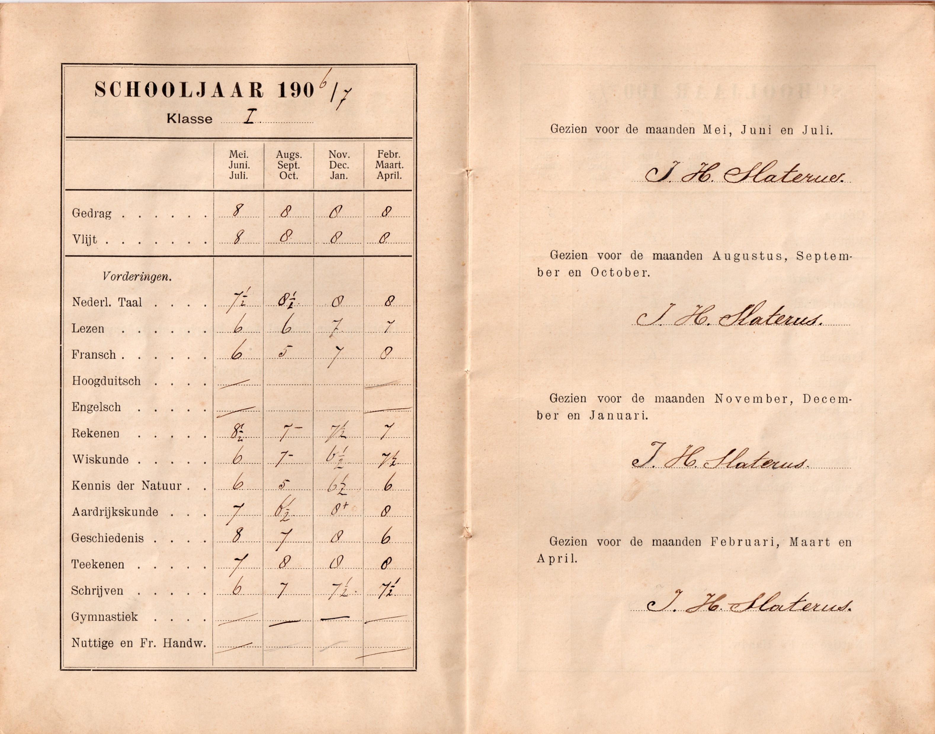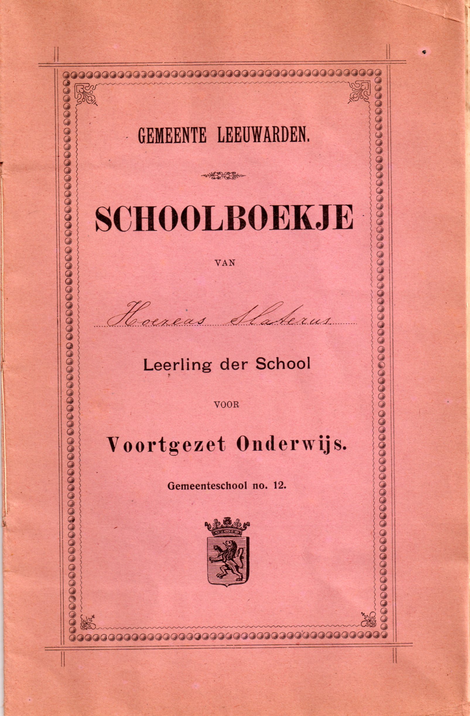 In 1906 kwam de nieuwbouw van de Gemeenteschool no. 12 aan Achter de Hoven klaar. In hetzelfde jaar kwam mijn opa, Hoezeas Slaterus, hier op school in de eerste klas. Uit zijn rapport van 1906 blijkt dat toen het schooljaar begon in mei en was opgedeeld in vier trimesters. Hij haalde goed cijfers. Alleen het Hoogduitsch, dat in het tweede schooljaar begon, beheerste hij minder goed: tweemaal een onvoldoende (een 5). Zijn favoriete vakken waren Aardrijkskunde (een 9 in het derde jaar) en Teekenen (een 8 1/2).
