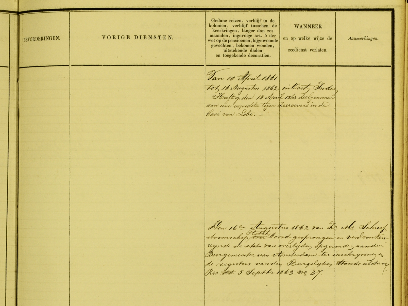 In mijn blog van 1 november jl. vertelde ik dat Johan Frederik Slaterus vrijgesteld was van de dienstplicht (Nationale Militie), omdat hij met zijn 1,53 meter te klein was bevonden. Toch vond ik in het Nationaal Archief zijn naam in het Stamboek van Onderofficieren en Schepelingen van de Zeedienst. Snel een kopie opgevraagd en wat blijkt: hij had zich op 11 mei 1860 gemeld als vrijwilliger bij de marine en getekend voor 4 jaar. Hij werd geplaatst als “vuurstoker 2e klasse” op het “wachtschip” te Amsterdam en op 16 september in dat jaar overgeplaatst op de Zijner Majesteits schroefstoomschip “Reteh”.