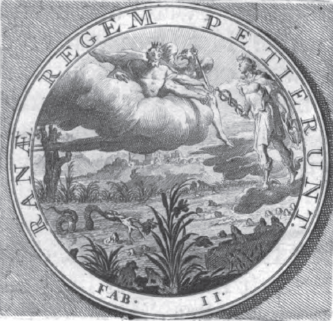 Zie daer dan, Boekzaellezer, Het tweede zinryke [=geestige] Esopisch verdigtsel [=fabel] van JAN PHAEDER VROLYKHART. De gekke Kikkerts begeren van Jupyn [=Jupiter=de oppergod] eenen Koning, of Stadthouder. [NB. Na de dood van Willem III kozen Holland, Zeeland, Utrecht, Gelderland en Overijssel geen nieuwe stadhouder. Voor deze gewesten begon dus een Tweede Stadhouderloos Tijdperk (1702-1747).] Wanneer Atheen, wel eer Princes der Grieksche steden, Gelukkig bloeide door haer welgeregeltheden, Heeft snoode dartelheit daerna die stadt ontroert, En ‘t ongebonden volk tot harrenwar vervoert. Dies komt Pisistratus [=tiran van Athene, H 527 v. Chr.], bekent voor slimmen Kater, En vischt zeer polityk in‘t troubel burgerwater. De kloeke gaeuwert [=sluwerd] maekt zich meester van ’t Kasteel: Men eert hem als een Prins: Klaes eert hem al te veel. Maer toen d=Atheensche vrye tongen Op hare wys klaeglieders zongen, Juist daerom niet, als of de Prins een wreedaert was, Maer omdat Vryman noit ‘t jokdragen komt te pas; Toen heeft Esopus pen dit zinryk digt geschreven. De Kikkers, die wel eer een vry en vrolyk leven Genoten in‘t moeras, begeerden van Jupyn, Met groot getier een man, die haer tot Vorst mogt zyn, Om door zyn hoog gezagh de weelderige zeden Te teugelen. De vaêr der Goôn [=de vader der goden] lacht om die reden; Dogh schonk uit kortswyl [=grap] haer een balkje tot een Heer En Meester; ‘t geen, zoo ras het viel op ‘t water neêr, De bange vorschen heeft door zyn gedruis doen beven. Dees houte Koning was zoo lang in ‘t slyk gebleven, Totdat een Kikvorsch by geval haer hooft om hoog, Dogh stilletjes, opstak. Nadat zy had ter degen Zyn Hoogheit onderzogt, was zy niet meer verlegen. Zy roept haer makkers, die terstont, en als om strydt Toezwemmen vry van vrees, ja dartel. Smaedt en spyt [=gramschap/wrok] Wort Prinsbalk aengedaen. Elk dartel kikker schalkje Bevuilt dien Oppervorst, ik meen ‘t onnoozel balkje. Men zond aen Jupiter flux [=met spoed] een Ambassadeur, Vermits [=omdat] ‘t Kikvorschdom dus was gestelt te leur. ‘t Verzoek was, dat Jupyn, tot heil der Kikkerswoning, Of Kikkersrepublyk, gelieve een ander Koning Te schenken, die met magt al dongebondenheit ‘t Mogt stremmen. Jupiter gaf hier een raer bescheit [=antwoord]. Hy zend tot Opperheer een van de waterslangen. Zoo dra‘t vergiftig dier den Scepter had ontfangen, Begon‘t, in plaets van dien te zwaejen met verstant, Elk kikker, man voor man, met drommels scherpen tant Te byten. ‘t laffe volk had byster gaerne ontweken; Maer ketst. Men kan uit vrees geen quaxroax meer spreken. En overmits [=aangezien/omdat] die diers het leven viel te zuur, zoo zond men een request [=verzoek] door d‘Advokaet Merkuur [=Mercurius, bode der goden] (Hoewel ter sluik [=in het geheim]) om dat in ‘s grooten Konings handen Te leveren; opdat der Kikkers nare banden Dogh mogten zyn ontdaen. Jupyn, dien juist de kop Niet stondt als voor, gaf dit royael bescheit hier op: Vermits gy Nikkers [=boosaardige watergeesten], of gy kikkers met den goeden Prinsbalk niet waert te vreên, verdient gy dezen roeden: Requesten doen ‘t hem niet. Schikt u in dezen staet, En maekt, dat u niet treff‘ voortaen een grooter quaedt. TOEPASSING. Zoo gaet het als men staet naer Staetsveranderingen. Zyt gy Republicain, tracht niet naer hooger dingen. Een oprecht Zwitser zingt: Wilhelm ben ich der Tel; Que vive la roi, hy niet ligt zingen zel. NB. Vergelyk hier mede, zoo ‘t u belieft, het geen wy leezen 1 Sam. VIII. Item Hos. XIII. vers. 11. Den hoogsten Heer Alleen geef eer, En wensch niet meer. Eodem Anno quo MunDUs Iste faLLIt & faLLItUr.