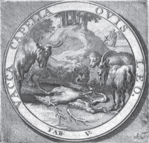 HET VYFDE VOLGEESTIG VERDICHTSEL VAN JAN PHAEDER VADER VROLIKHART. De koe, de Geit, het Schaep en de Leeuw. Alias, Het ongelyk Gezelschap. Jan! Jan! gy moet zoo licht met Grooten niet verkeeren; Het zou u deeren! Dit klein Verdichtsel toont het geen ik u wou leeren: De Koe, de Geit en ’t Schaep, dat altyd is geduldig, Gaen met den Leeuw ter jagt. (de jagt is menigvuldig) Daer wierdt van deeze maets een groot Hart [=hert] opgedaen, Het werd gevierendeelt. De Leeuw dan ving dus aen Te spreeken: ’t Eerste stuk neem ik in Creons [=koning van Corinthe] naeme: Het Tweede zult gy My, als Held, ook toestaen t’ saeme: Het Derde, mits [hier: omdat] ik meer vermag [=de macht heb], My ook genaekt [=toekomt]: De drommel [=duivel] hael die keerl, die ’t Vierde maet aenraekt, Dus heeft de forsse guit den heelen Buit genomen. Wy wenschen, dat het Hem mag drommels wel bekomen. TOEPASSING. Kies geen grooter medemaet. Want het was ten tyde van Vader Phaeder niet goet, met groo groo groote Hee Hee Heeren ker ker kerssen te eeten; zy koo koo koozen de groo groo grootste, en smeeten in het lae lae laetste met de stee stee steenen [=pitten], dan ging men hee hee heenen, somtyds naer Wee Wee Weenen, verre buiten Kroostenryk. Hoe het hedendaegs toegaet, in de Landen daer Koningen en Vorsten den Scepter zwaeien, weet niet ter dege: ook is my daer luttel [=weinig] aen gelegen. Ben Scholastyk [=geleerde in de theologie/wijsbegeerte], meer als Polityk. Godt dank! Wy leeven in een goede Republyk. Eodem ANNO quo MUnDUs Iste faLLIt & faLLItUr. [M+V+D+V+I+L+L+I+L+L+I+V=1718]