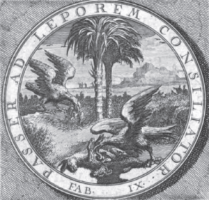 HET NEGENDE ZINRYKE VERDICHTSEL. DE MUSCH EN DE HAES. Of: Het ongelukkige en zelfs Berispelyke Berispertje. ‘k Zal mynen Lezer in een kort gedicht vertoonen, Hoe gek het zy, wanneer men Anderman Wil raên [=raadgeven], en echter zich niet zelve wagten [=in acht nemen] kan. De Musch bekeef den Haes (’t ging toe niet zonder hoonen.) De Haes kreet overluit, na dat de Adelaer Hem als een Franschen Martelaer, Te grof mishandelt had met zyne forsche klaeuwen. De Musch, de Snapster [=babbelaarster], om hem wreeder te benaeuwen, Zei: Hazekop, hoor hier! steek op ’t langwerpig oor! Vermaerde Looper! Hoe! waerom niet, als te voor, Geloopen? Maer terwyl de Musch dus komt te kallen [=spreken], Heeft haer gansch onvoorziens een Havik overvallen. Zy schreeuwt vergeefsch: Help! help! de snapster wordt gedoodt. Dit deed oomkool [=sukkel/vgl. haas] noch goed in zynen jongsten noot. Dees zieketrooster roept: Slyp! slyp! gy neuswys wigtje, Dat my thans heeft bespot, Beschreit nu slimmer lot! Een Haes is ’t die nu lacht om zulk een Uitvaertdichtje. TOEPASSING. Verbly u nooit om iemants val, Wie weet wat u gebeuren zal? Vid. [=Zie] Thren. [=Grieks: ‘rnoV=klaaglied] Jerem. [=profeet Jeremia] IV.21. [Zie de: Klaagliederen van Jeremia, boek IV, vers 21 / Oud Testament]. Item ibidem [=aldaar], in het einde van het zevende vers. Item in ’t midden van het negende. Item ibidem vers 16, 17, 21, 22. ’t Zyn dwaeze Profeeten, die anderen willen leraeren, berispen en waerschuwen, en echter in het midden van hunnen nood niet eens verdacht zyn op hun eige doot. Zoodanige berispers worden in hunnen nood niet alleen niet beklaegt, maer noch bespot en belacht. Exempli gratia. [=als voorbeeld] Hoe belacchelyk stont het, wanneer zeker Martial in den slag by Malplapla [=fantasie?] tegen zyn Camarade, die door eenen vyantlyken kogel geraekt was, zeide: Que diable!, heb je niet wat kunnen bukken? de kogel zoude u dan over den kop gevlogen hebben. Quid fit? [=wat gebeurde er?] terwyl de berisper sprak, Vliegt hem een kogel door den kop. Daar lag de doedendop [=dood omhulsel]. Geen vermaekelyker Justitie, Als even wen Joost Spotter zelfs eens raekt in d’ Inquisitie. Eodem ANNO, quo MunDUs Iste faLLIt & faLLItUr.