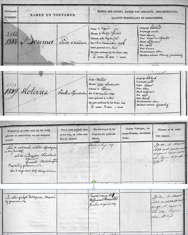 Ik wist dat mijn oudvader, de grootvader van mijn overgrootvader, tijdens zijn huwelijk Fusilier was in dienst van het 8e Regiment Infanterie (Huwelijkse bijlagen uit 1822). Het was even zoeken, omdat de lichting van 1819 in meerdere boeken (en dus op meerdere films) voorkomen. Maar na twee uur bladeren vond ik de gegevens van Idanus Hendrikus Slaterus. Voor het eerst had ik een signalement van hem!