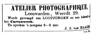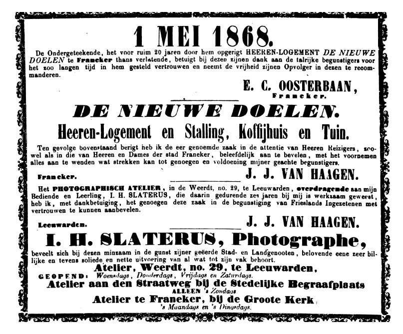Op 1 mei 1868 verschijnt er een grote advertentie in de Leeuwarder Courant waarin J.J. van Haagen aankondigt dat hij vertrekt naar Franeker en zijn “PHOTOGRAPHISCH ATELIER in de Weerdt No 29 te Leeuwarden” overdraagt aan zijn “Bediende en Leerling, I. H. SLATERUS, die daarin gedurende zes jaren bij mij is werkzaam geweest.”