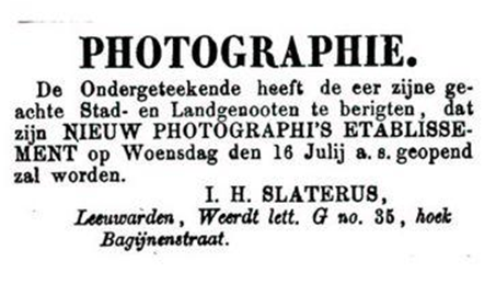 De dagen ervoor had Slaterus al verschillende keren de opening van zijn nieuwe “photographi’s etablissement” aan gekondigd. Hij moet wat geld uitgeven om z’n (mogelijke) klanten niet te verliezen…
