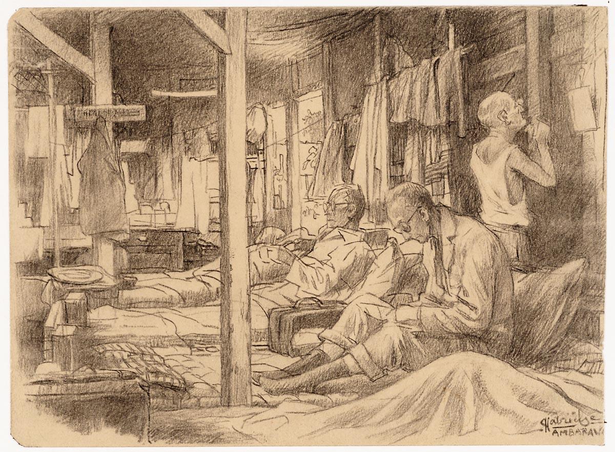 Bijschrift: ‘Een tekening van het interieur van een van de barakken van het mannen- en jongenskamp te Ambarawa. Erboven staat: “Het inwendige van vroeger voor alles afgekeurde barakken, nu mannen- en jongenskamp.” Eronder: “Behalve de bouwvalligheid zat dit kamp nog voller met wandluizen dan de andere kampen.” Afgebeeld zijn: Dr Slaterus, J. Moree en de Gelder. Twee van hen zitten, een staat en scheert zich.’