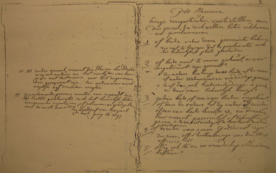 NB. Zonder speciael consent des Heeren Landdrostes [ = hoogste bestuursambtenaar ] mag een weduw na het overlijden van haer man niet hertrouwen voor dat negen maenden geexpireert [ = afgelopen ] zijn. Een weduwnaer moet insgelijks vijf maenden wagten.