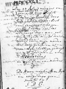 Den 23. Juli, ’s morgens om 3 uiren, is mijn Liefste wederom geluckig, door Godes goedheit verlost van een regtschapen jonge Zoon, die des Zondaegs daar aan volgende, zijnde den 30. derselve maand, door mijn moeder ten doop gehouden is en van mijn Collega gedoopt is met de naam van Hendericus, na zijn Oom van Moeders zijde. De Heere maeke Hem Rijck en voege daar geen smerte bij!