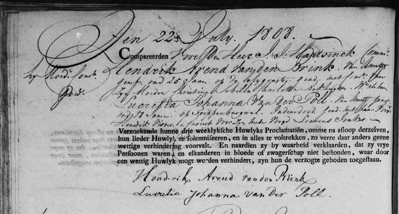 Hendrik en Lucretia zijn op 17 augustus 1808 in Amsterdam getrouwd. Op 22 juni hebben zij aangifte gedaan van hun voorgenomen huwelijk: