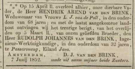 - Rodolphus Joannes van den Brink, 16 december 1819 – Passarouang (Java) 5 maart 1852.