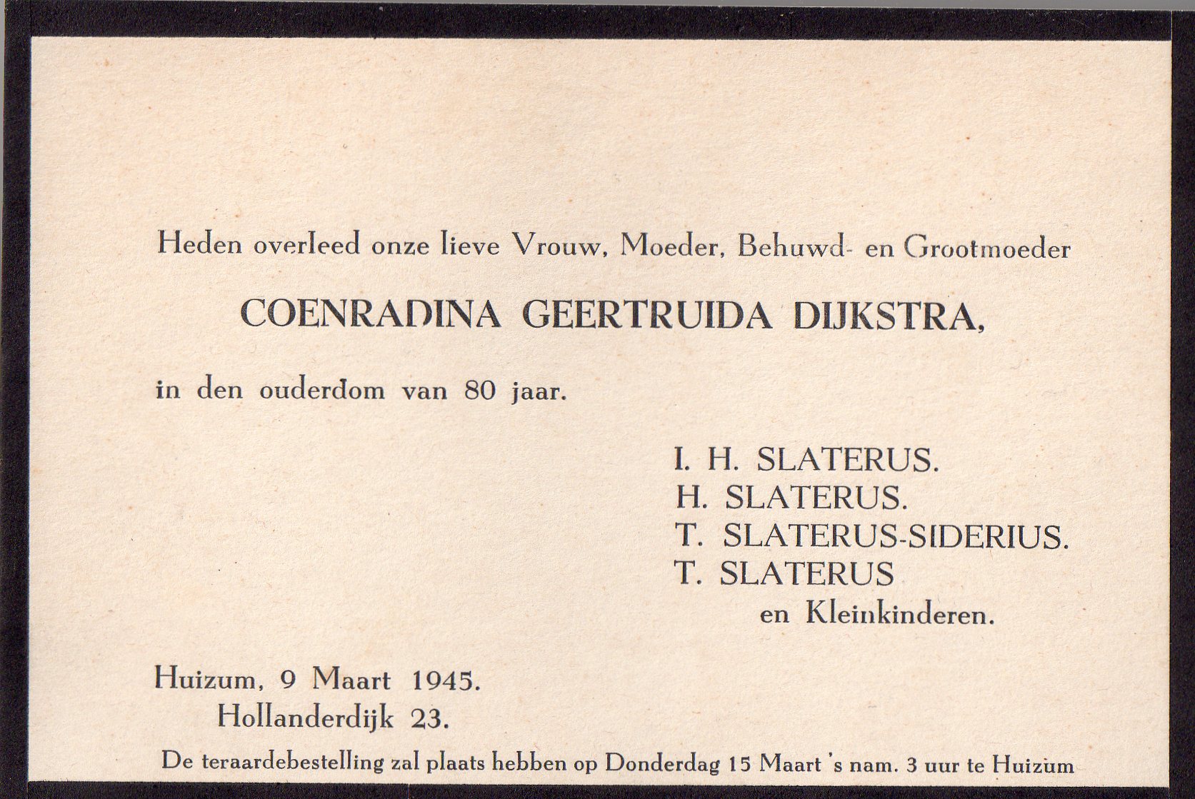 Vlak voor de bevrijding van Nederland, op 9 maart 1945, overleed mijn overgrootmoeder Coenradina Geertruida Dijkstra (geb. 1865), echtgenote van Idanus Hendericus Slaterus (1859-1959).