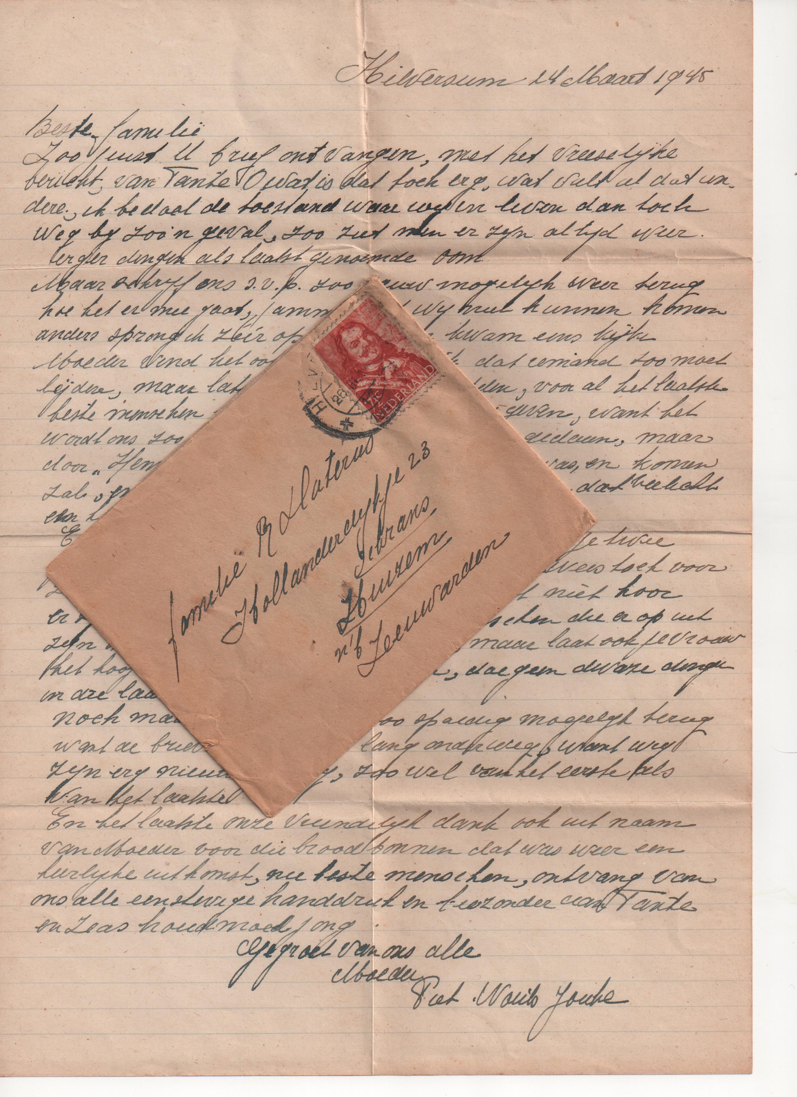 En het laatste onze vriendelijk dank ook uit naam van Moeder voor die broodbonnen, dat was weer een heerlijke uitkomst, nu beste menschen, ontvang van ons allen een stevige handdruk en biezonder aan Tante en Zeas houd moed jong.