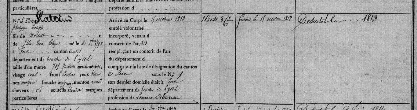 En ik vind vanmiddag zowaar een Slaterus, dus bij deze de inschrijving van jouw verwant …”Philippe Joseph” (zo heette hij tenminste volgens de Fransen), die eind 1813 nog een paar weken in het “124e régiment d’infanterie de ligne” diende voordat de prins van Oranje bij Scheveningen landde en daarna uiteraard prompt deserteerde, zoals bijna iedereen in zijn regiment.