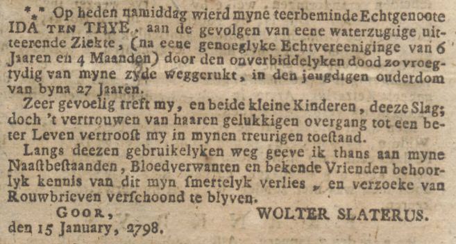 Toen zijn eerste vrouw op 15 januari 1798 overleed, bleef Wolter Slaterus met twee kleine kinderen achter.
