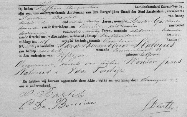Vandaag was er een nieuwe aanvulling en vond ik de gegevens van Sara. Ik wist uit de overlijdensakte al dat ze op 14 augustus 1846 in het Buitengasthuis aan de Overtoom in Amsterdam was overleden. (Ze woonde toen in de Laurierstraat nr. 23) Twee “bedienden” van het “Buiten Gasthuis”, Paulus Bartels en Cornelis de Bruin, deden de aangifte op het stadhuis.