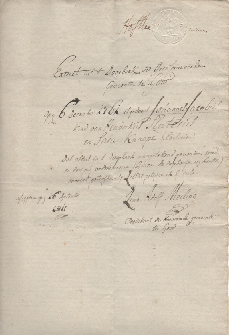 Waarom dit extract uit het doopboek in 1811 is gemaakt is niet bekend. Het papier bevat het zegel van het (Eerste) Franse Keizerrijk, waarvan Nederland tussen 1810 en 1813 deel uitmaakte. Mogelijk was Johannes Jacobus druk bezig met solliciteren naar een baan bij de overheid. Uit de huwelijksakten van twee van zijn kinderen uit 1817 weet ik dat hij toen geëmployeerde bij het Ministerie van Financiën in Den Haag was en dat hij daar woonde op het adres Westeinde No. 62.