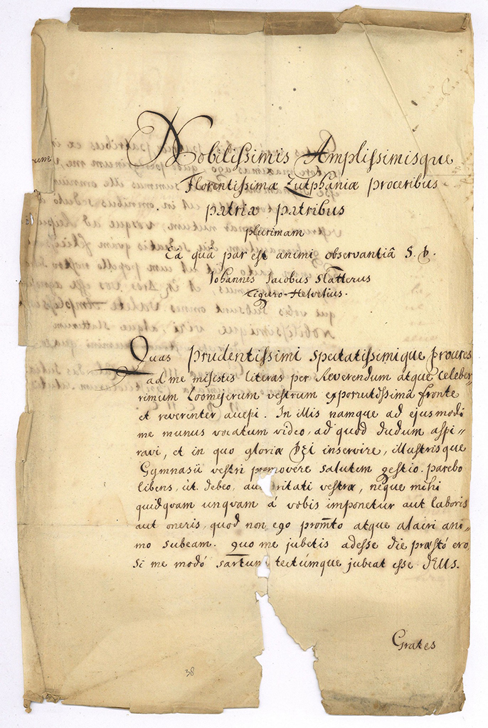Ik, Johannes Jacobus Slatterus, afkomstig uit Zürich in Zwitserland, groet u, zoals het hoort met de hoogste eerbied, weledele en hooggeachte bestuurders en senaat van de zeer bloeiende stad Zutphen.