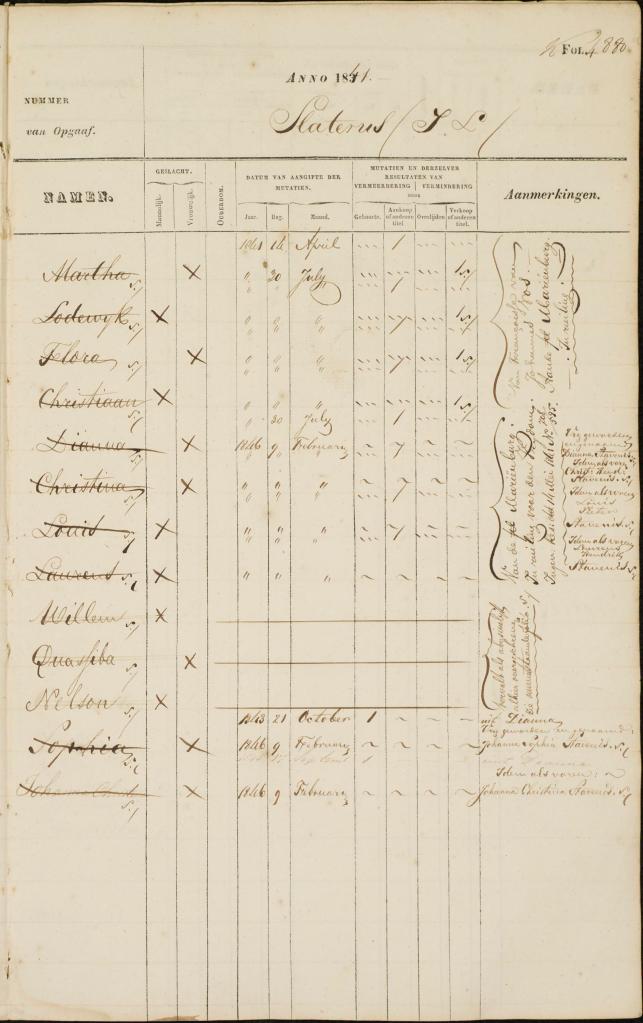 Op 31 oktober komen op het internet oudere series Slavenregisters (1830-1850) vrij. Toch waren ze onlangs al even te raadplegen, misschien een test of een foutje van het Nationaal Archief. Ik kwam daar een scan tegen van de Surinaamse “stamvader” Sander Louis Slaterus, als eigenaar van slaven. Deze nieuwe informatie geeft een heel andere kijk op het “vrijkopen”(manumissie) van zijn geliefde en kinderen.