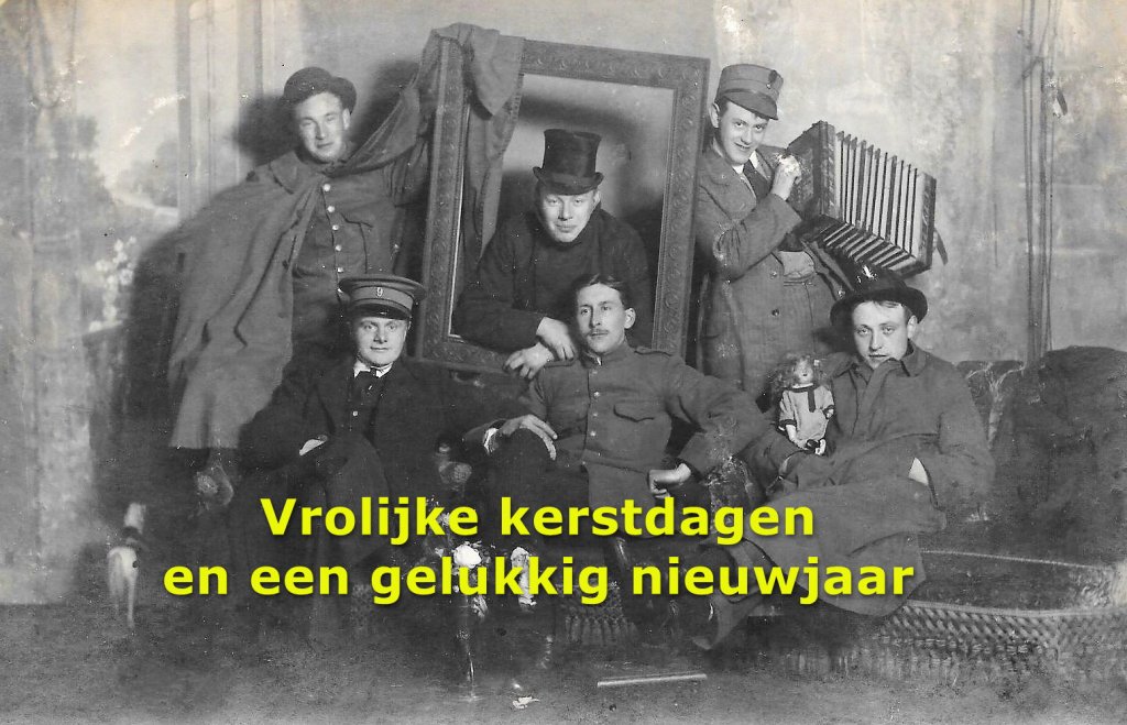 Ik schat dat deze foto tijdens de mobilisatie van 1914 is genomen, gezien de militaire uniformen die twee van zijn vrienden dragen. Helaas zijn mij de namen van de vrienden niet bekend.