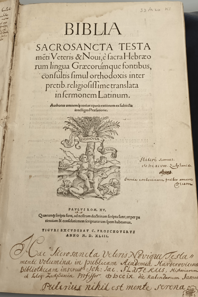 Haec Sacrosancta Veteris Novique Testamenti volumina in publicam Academiae Harderovicenae bibliothecam inseruit Joh: Jac: Slaterus, Historiarum et Eloq: Zutphaniae Professor. MDCCIX. Die kalendarum Januari. Pulcrius nihil est mente serena.”