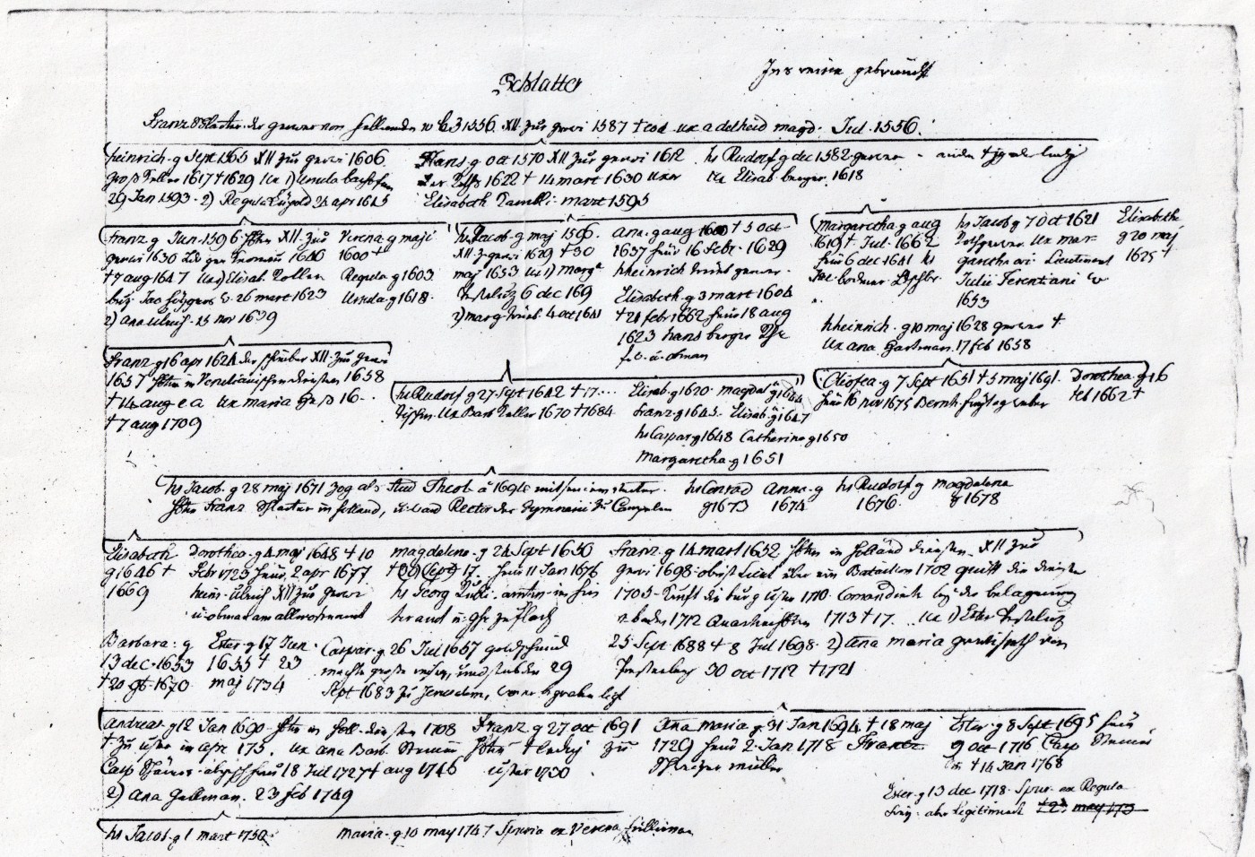 In 1891 al is een genealogie Schlatter samengesteld door medewerkers van het Stadtarchiv Zürich. Dit schema gaf duidelijkheid over de vraag welke zoon van Franz Schlatter de vader van Hans Jacob was. Dit was tot dat moment de ontbrekende schakel. Toen ik in 1985 het genoemde archief bezocht werd me hetzelfde schema getoond. Het archief was volgens mij in al die jaren ook niet veranderd! Een prachtig historisch pand in de binnenstad van Zürich, oude kamers met krakende houten vloeren en piepende deuren… Het archief was echter inhoudelijk niet zo toegankelijk als de archieven zoals ik die kende in Nederland: weinig bronnen waren geïndexeerd en op microfilm en -fiche te raadplegen. Ik dus was afhankelijk van de hulp van een archiefmedewerker die mij, zeer bereidwillig overigens, een aantal originele bronnen heeft laten zien. Ik heb daarvan gretig fotokopieën en foto’s gemaakt. Later zal ik daarvan één en ander laten zien.