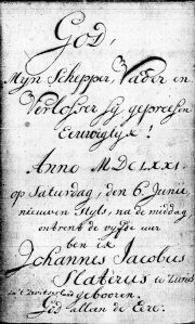 Anno MDCLXXI, op saturdag, den 6 Junii, nieuwen stijls, na de middag, omtrent de vijfde uur ben ik Johannes Jacobus Slaterus te Zürich in ’t Zwitserland gebooren.