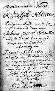 Mijn waarde Vader Rodolph Schlatter, Burger en Koopman te Zürich, was de zoon van Johan Jacob Schlatter wel bemiddelt Burger ende Koopman te Zürich, afkomstig van Franz Schlatter, die, geboortig van Faelanden, sijnde een dorp in het Zürichergebied, tot Burger te Zürich is aangenomen, den 5 Junii 1556, gelijk sulx is aangeteekent in het getalrijke Burgerboek der Stadt Zürich.