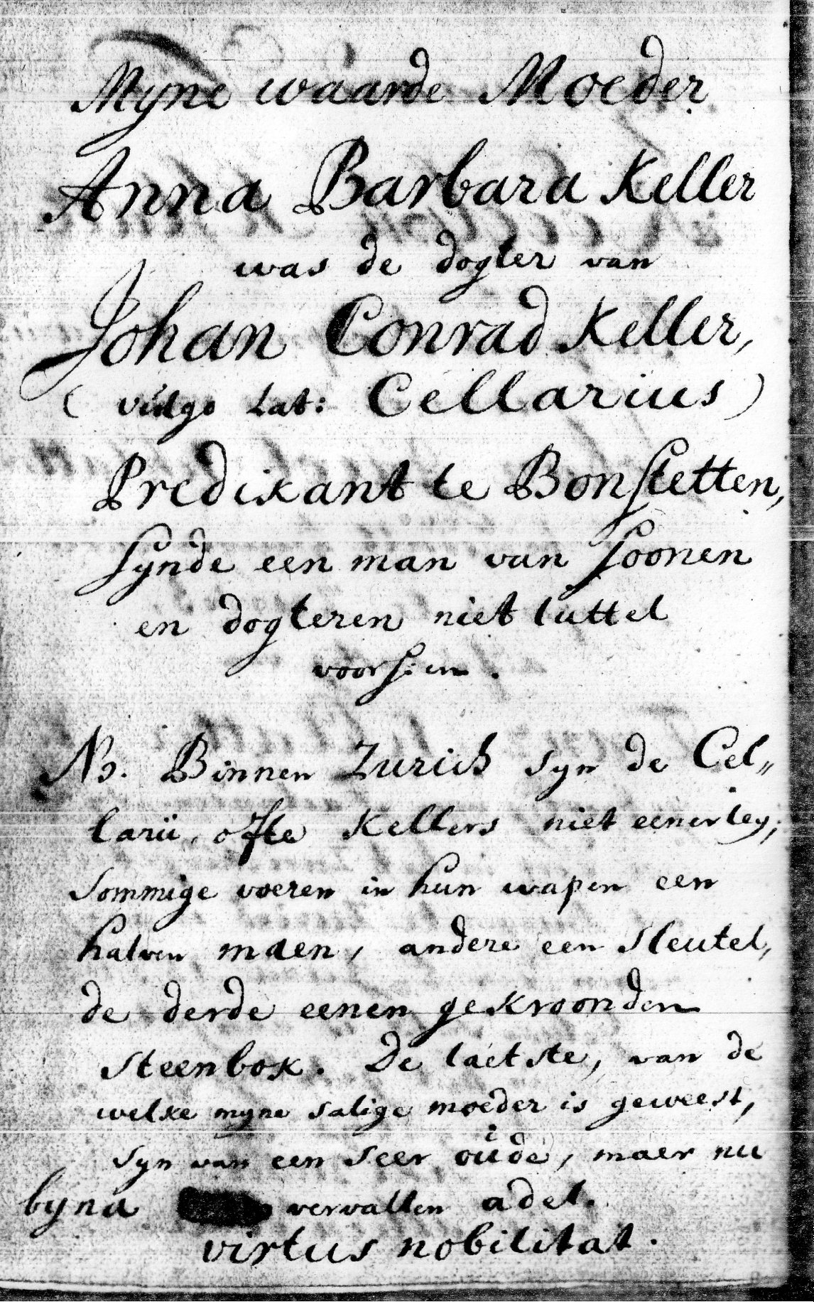 Mijne waarde Moeder Anna Barbara Keller was de dogter van Johan Conrad Keller (vulgo Lat: Cellarius), Predikant te Bonstetten, sijnde een man van soonen en dogteren niet luttel voorsien.